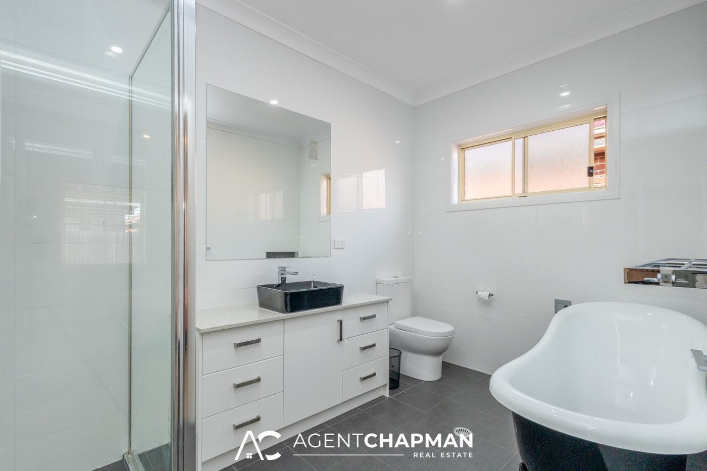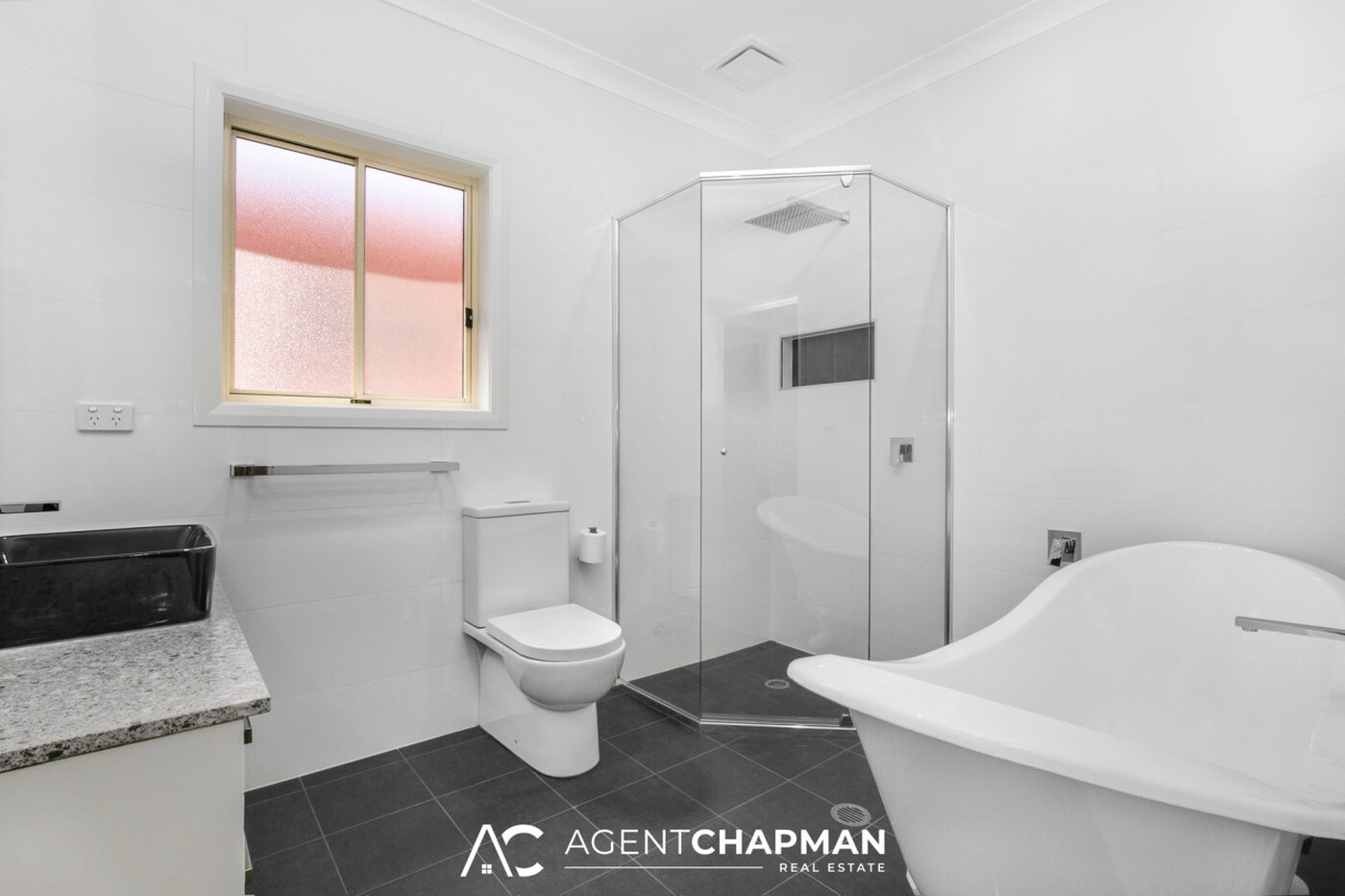 - Bathroom features shower, bath, vanity, toilet and access to the main bedroom.