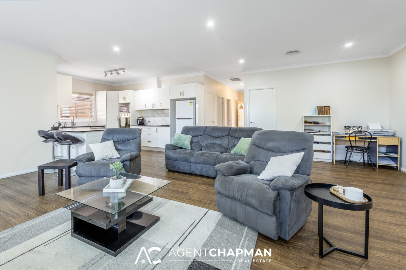 - Open-plan living/dining/kitchen area with ceiling fans.