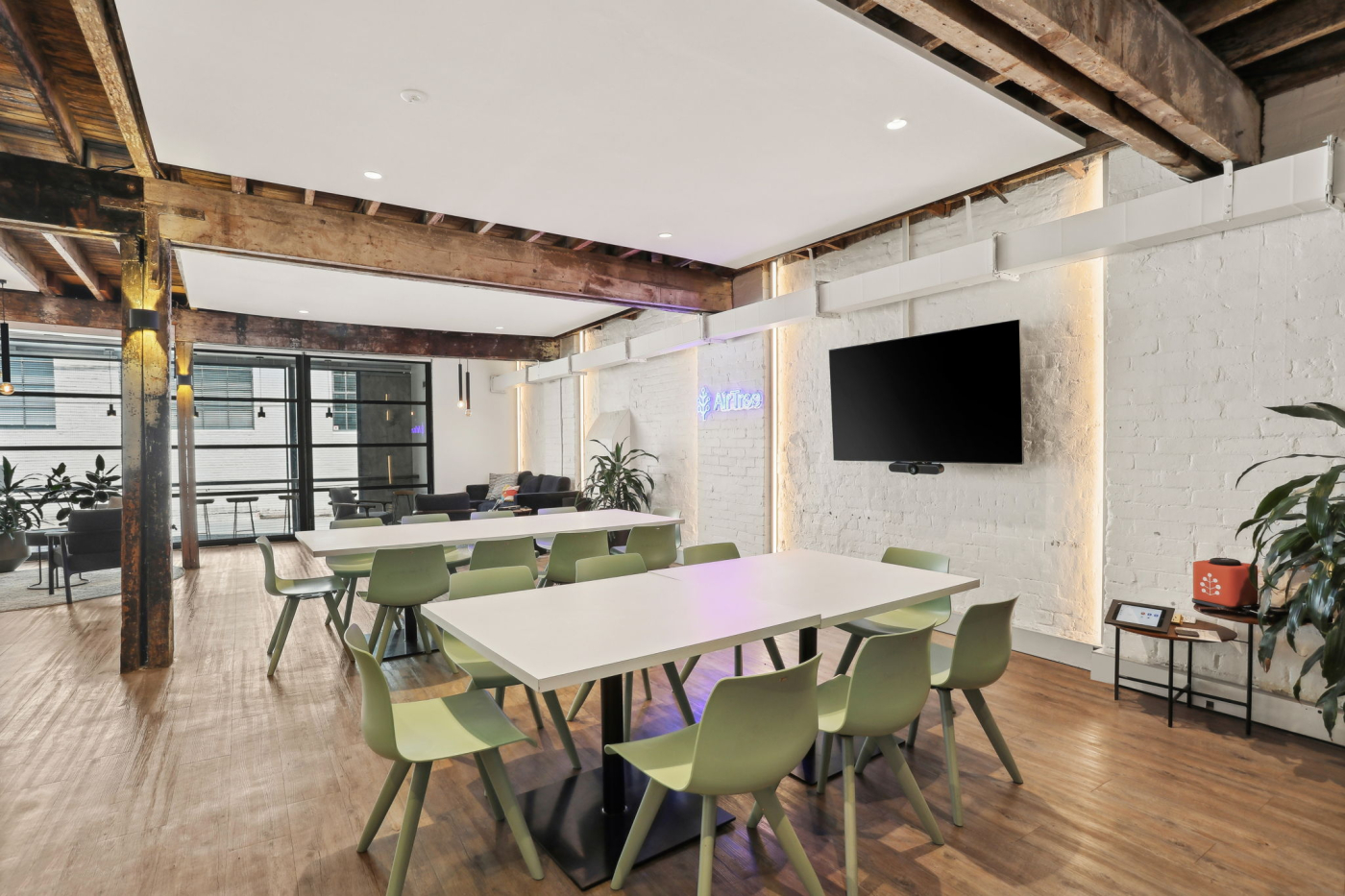 - Features exposed brick walls, vintage industrial signage, high ceilings, and large windows that bathe the space in natural light