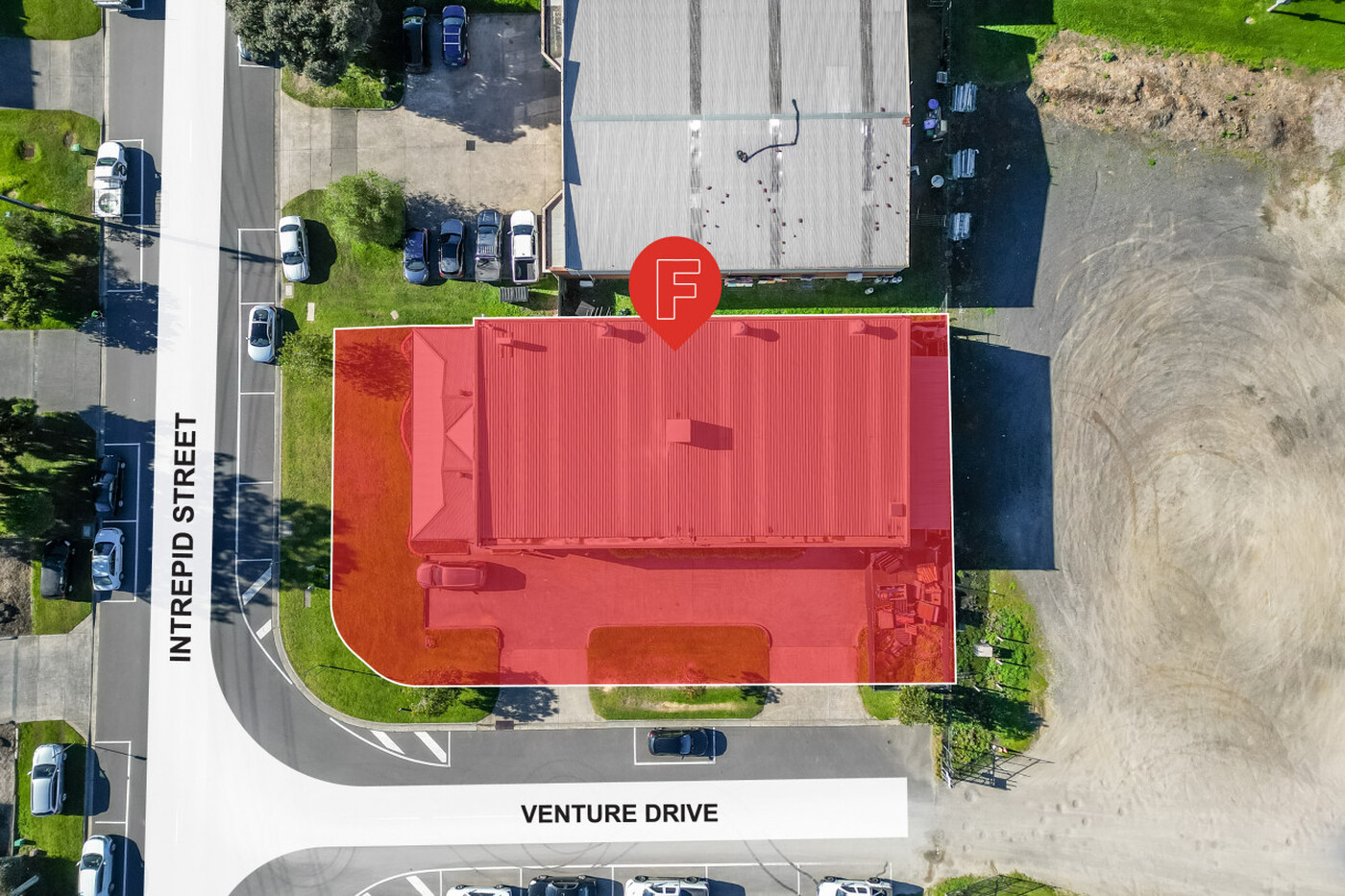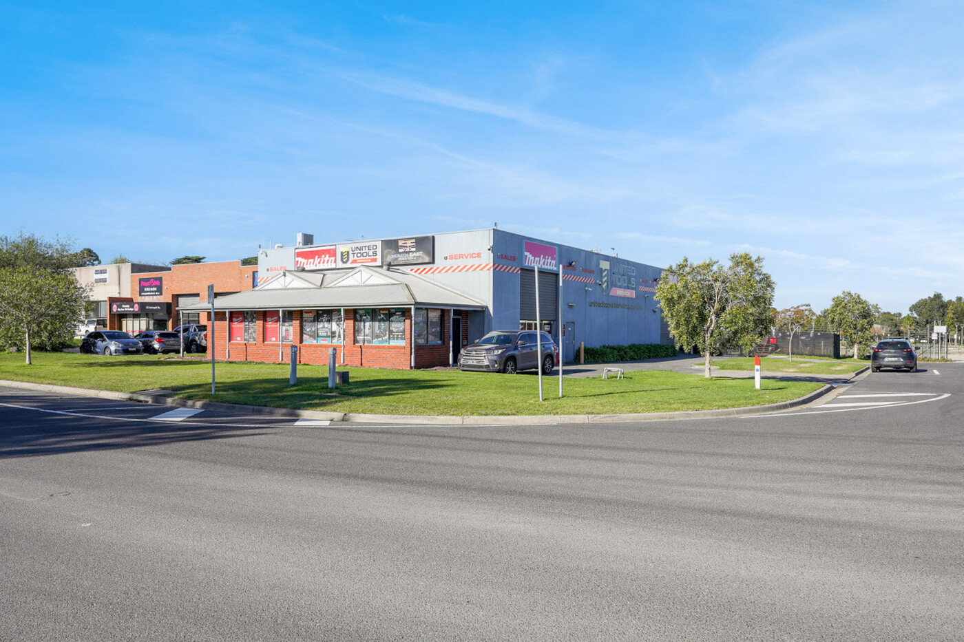 The corner premises comprises two crossovers with matching roller doors plus an additional internal 48m² storage mezzanine.
