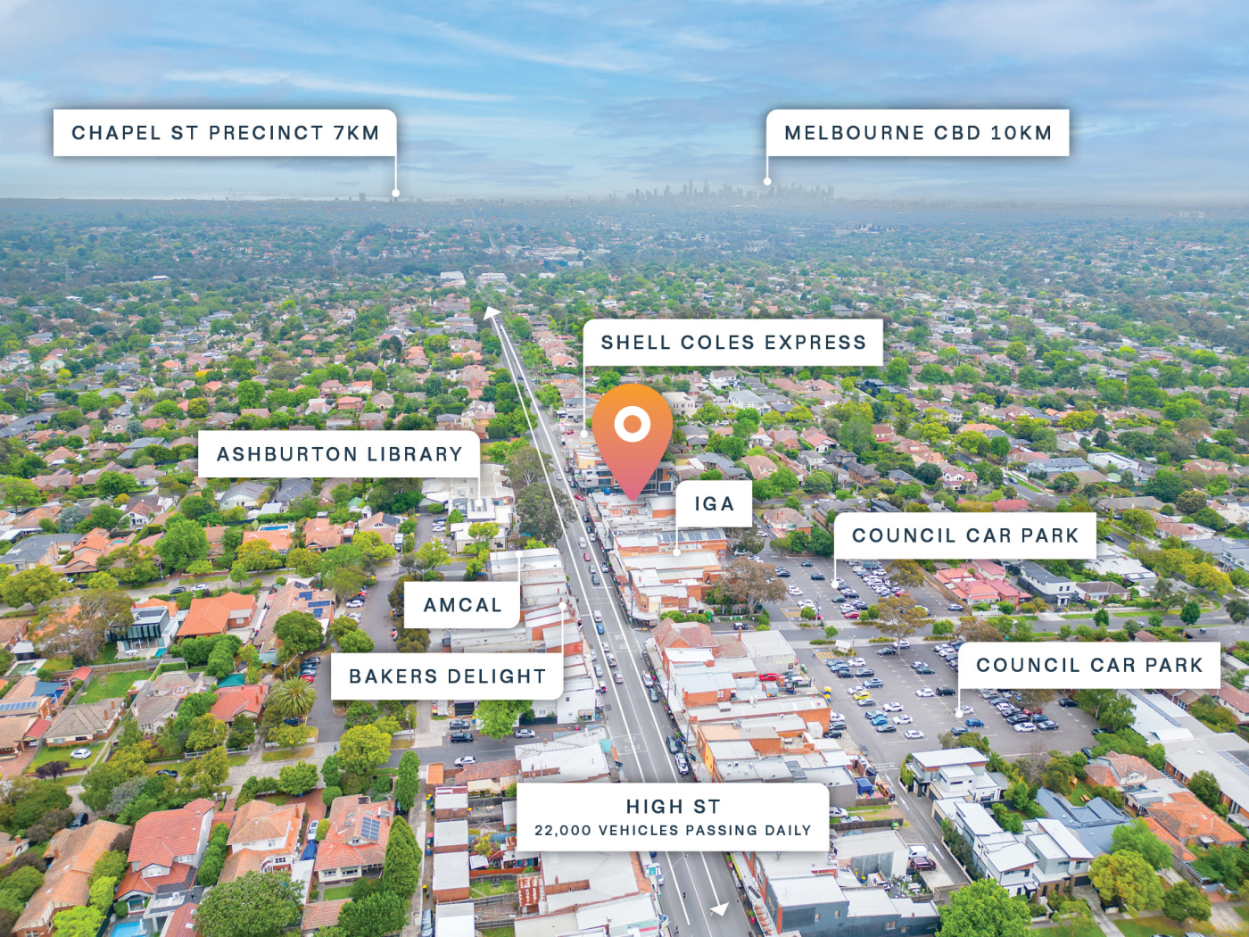 + Exposure to High Street, a major metro Melbourne commuter road serviced by major arterials including Monash Freeway/City Link and Warrigal Road - over 22,000 vehicles passing the property daily**