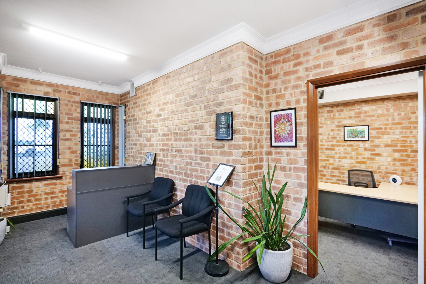 - Large reception area with multiple partitioned offices