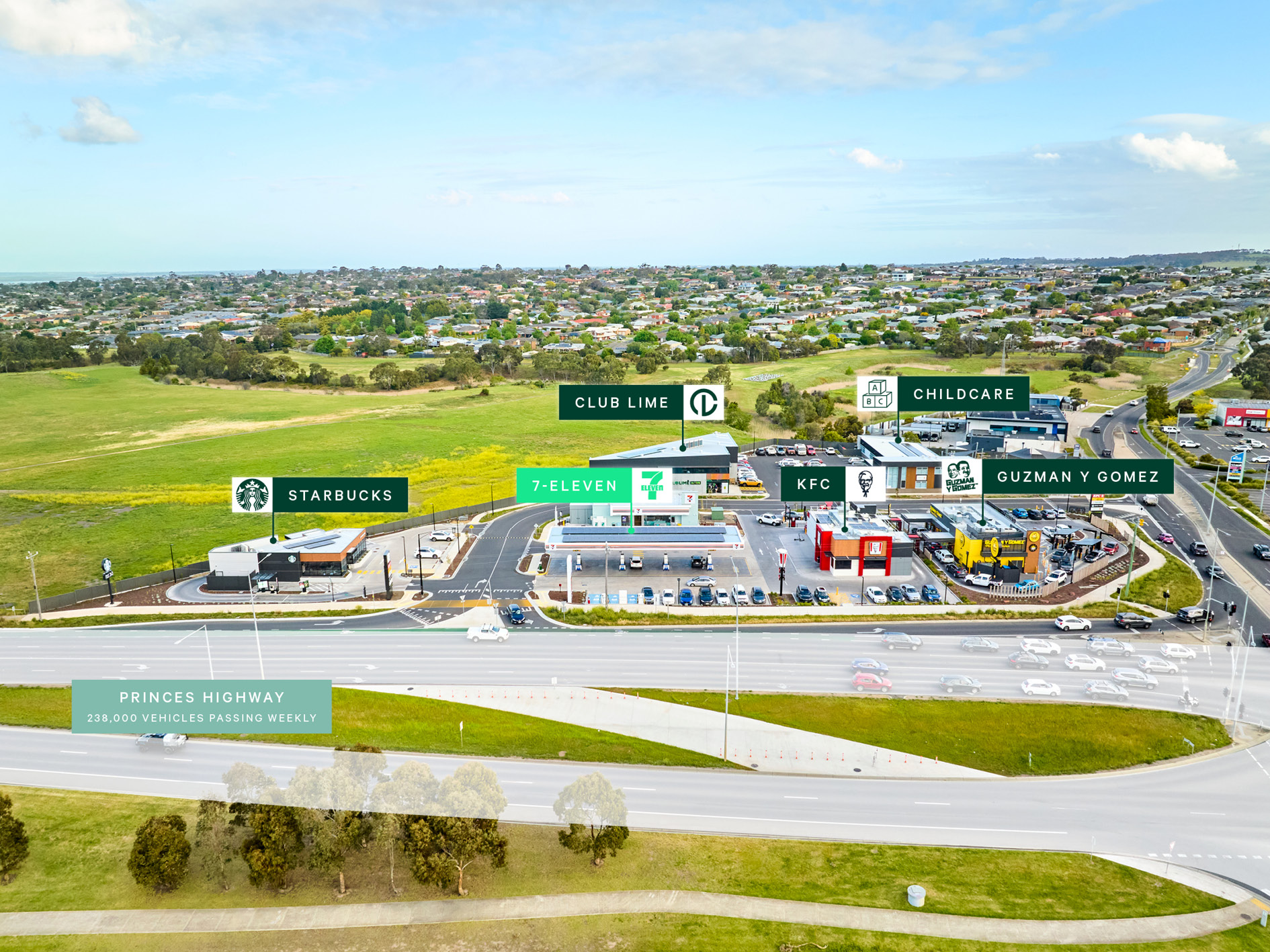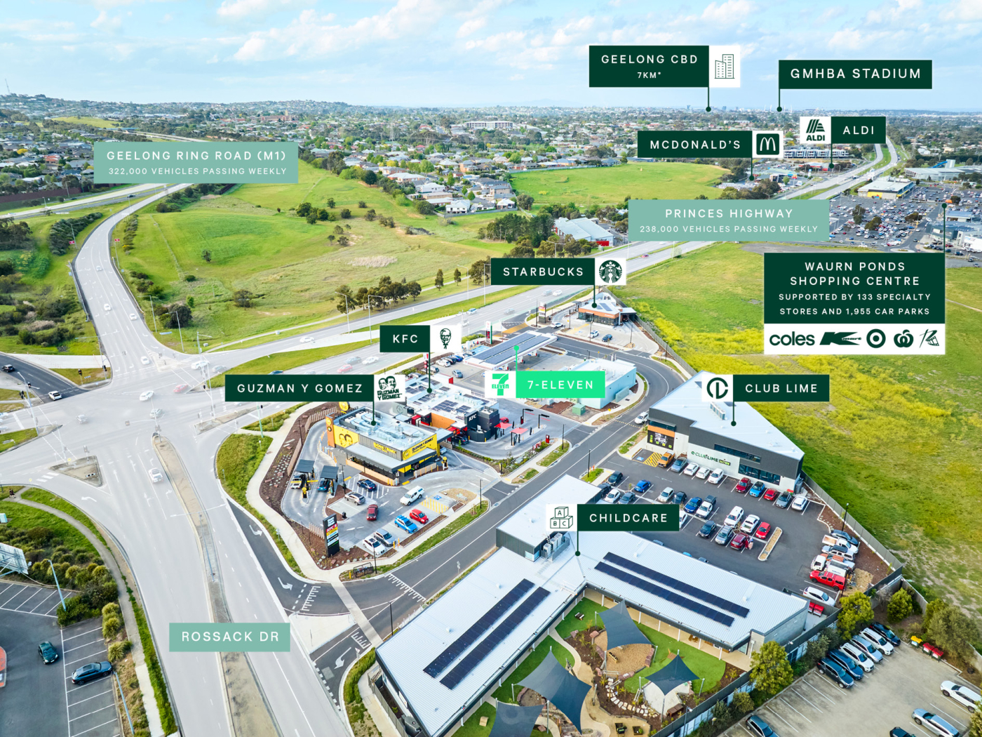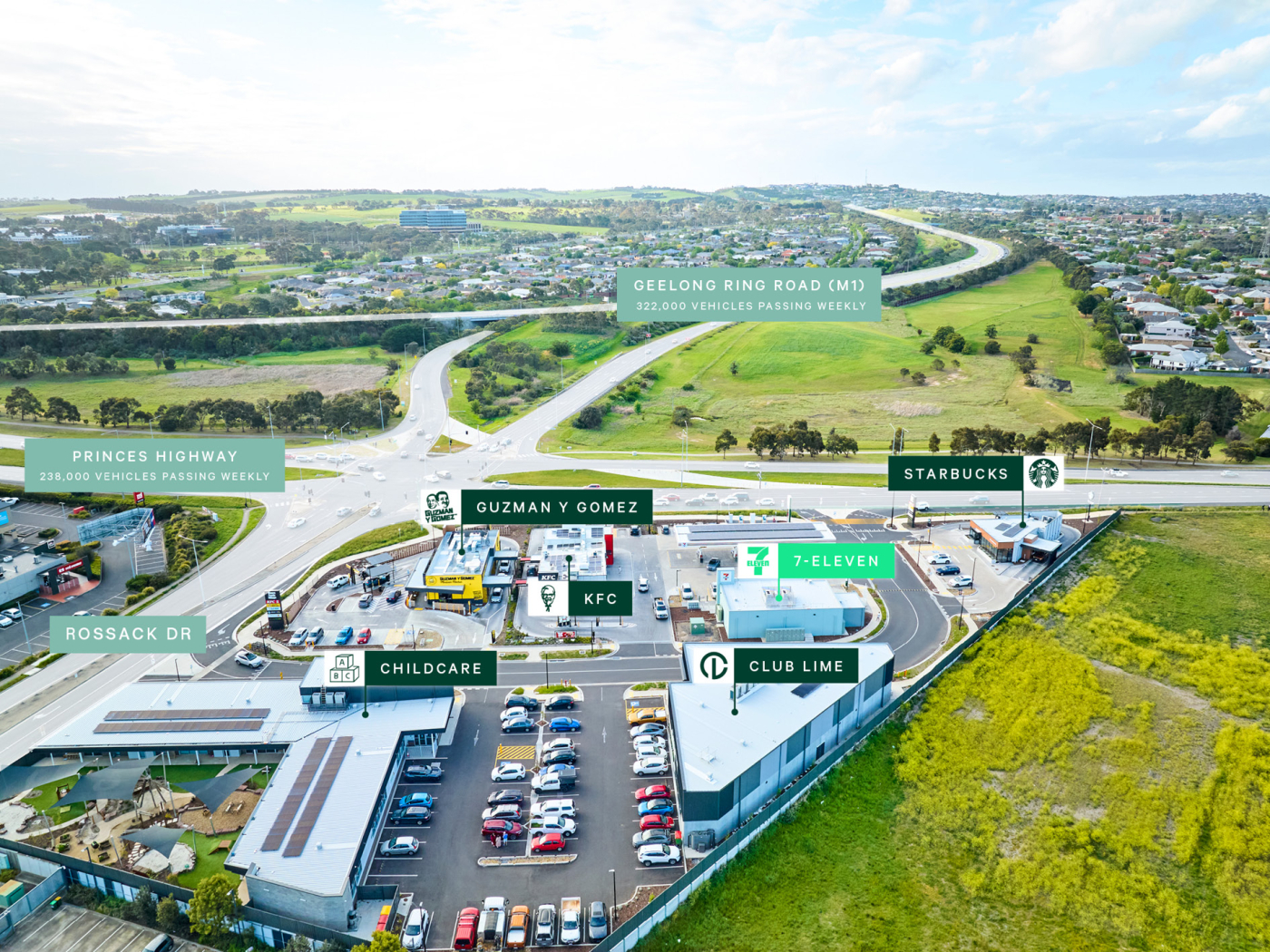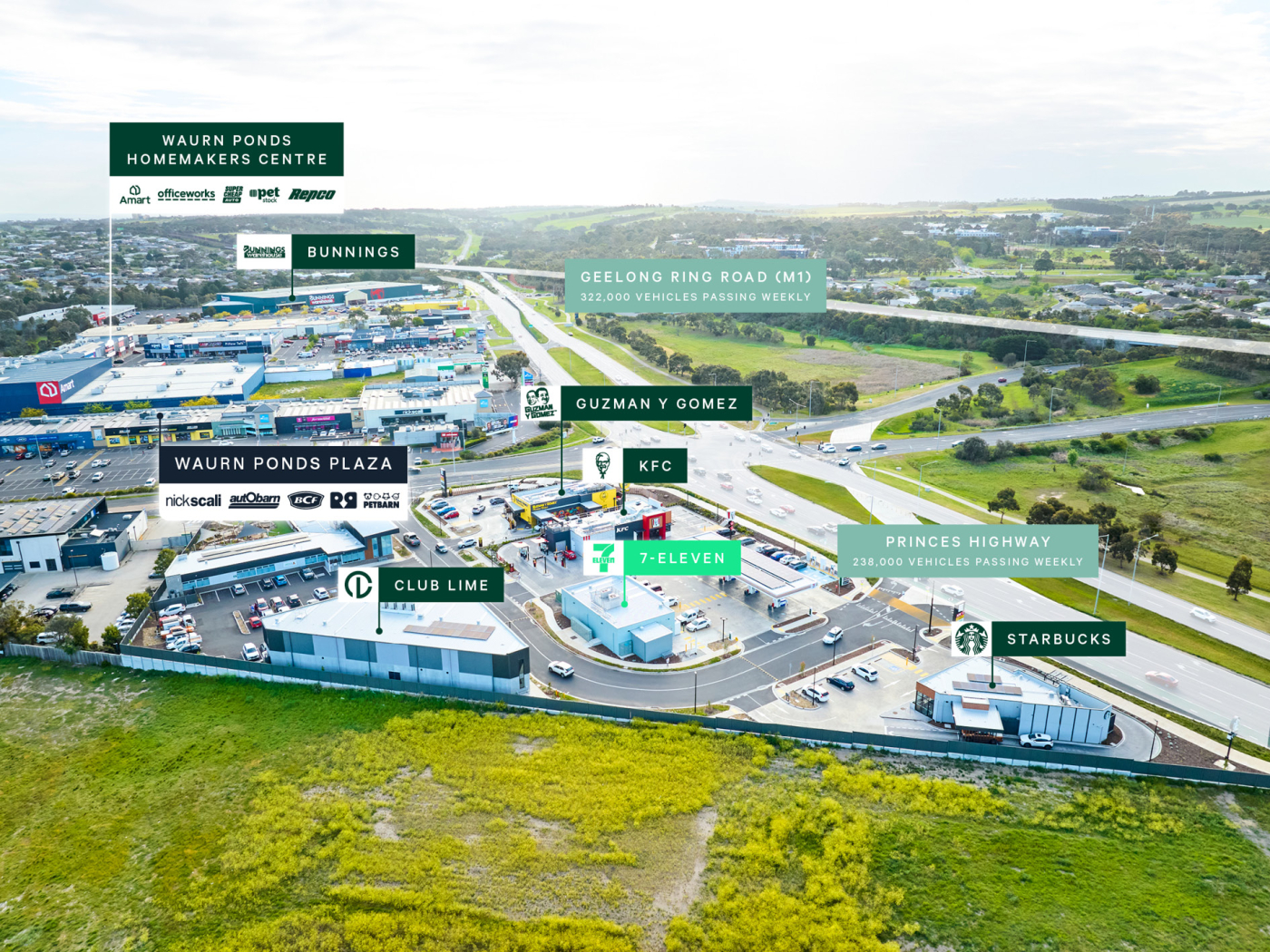 + The site also benefits from close proximity to Geelong Ring Road (M1), a critical arterial which connects the iconic Surf Coast to metropolitan Melbourne services an additional 322,000 vehicles passing weekly****