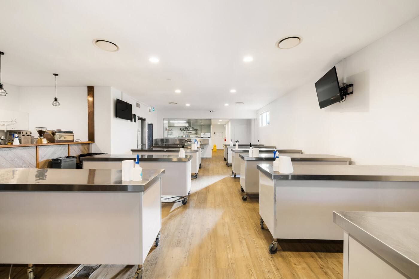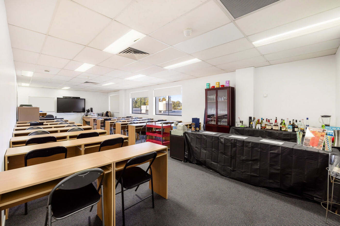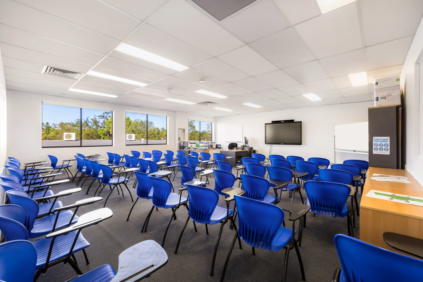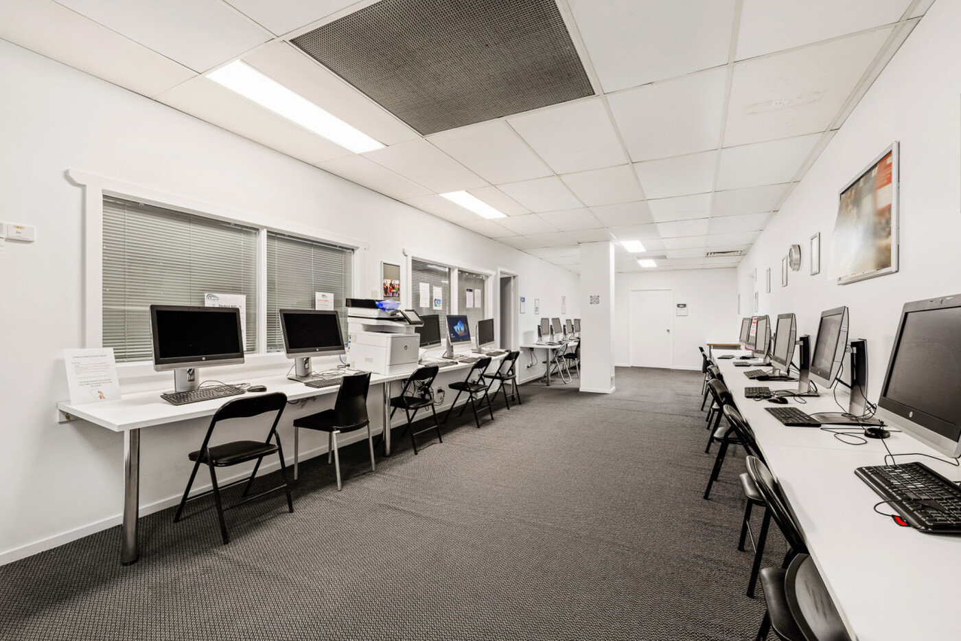 - First Level: Large reception area, 5 open plan training rooms, large staff area with meeting room, student kitchen and common area with amenities.