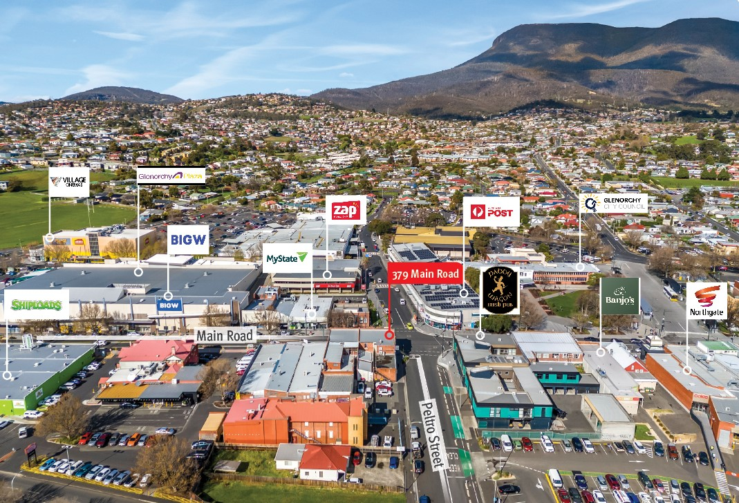 379 Main Road, Glenorchy occupies a high-profile corner position within the tightly held Glenorchy commercial precinct, surrounded by 3 major shopping centres, including Northgate, Glenorchy Plaza and Glenorchy Central.
