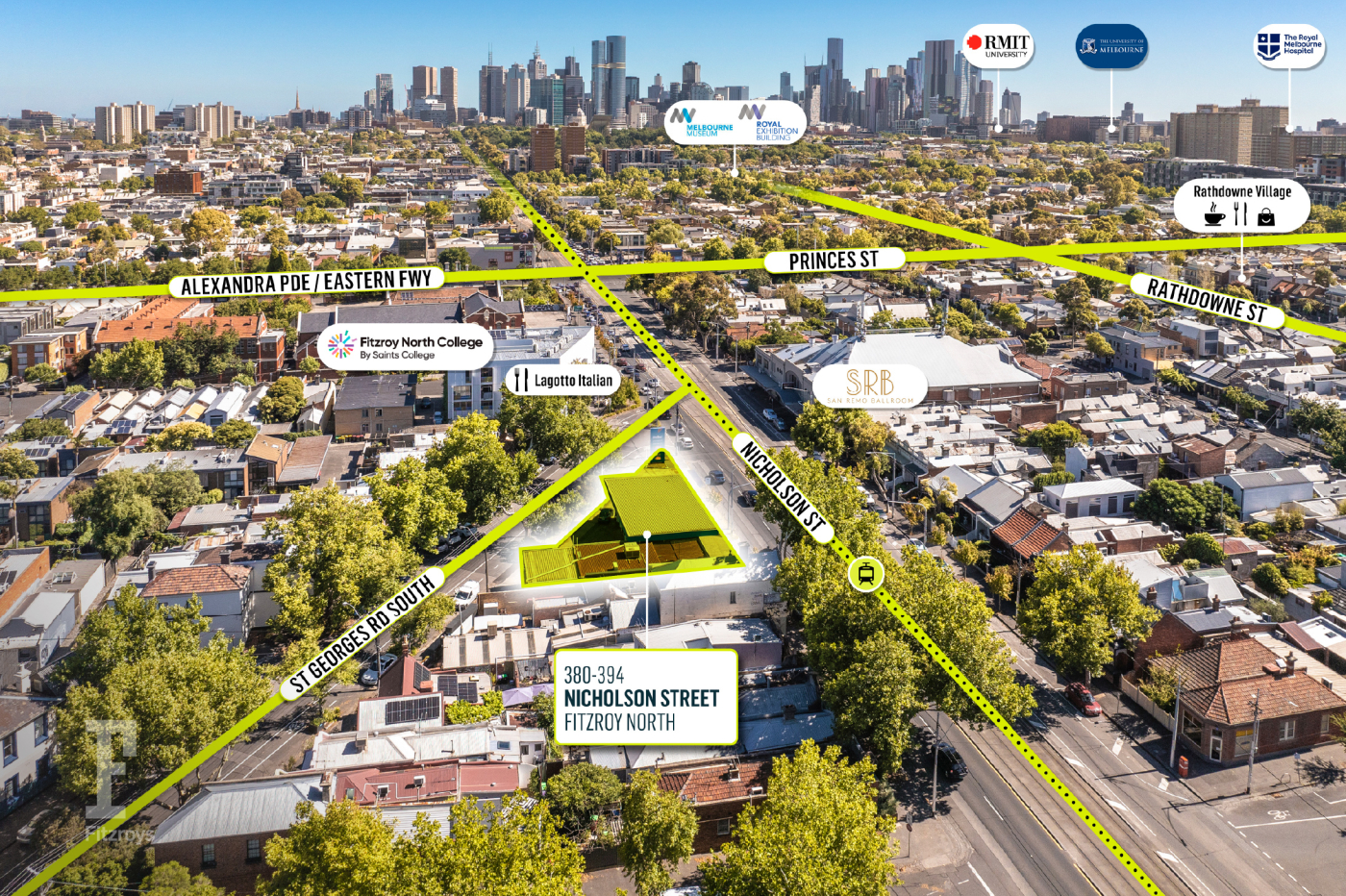 - Conveniently accessible by public transport with No. 96 tram operating along Nicholson Street and bus services operating along Alexandra Parade