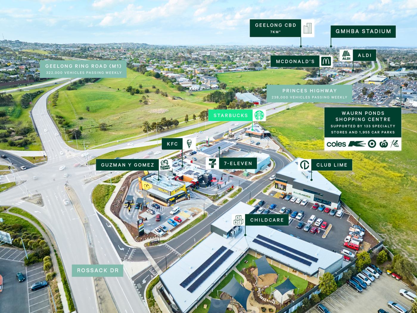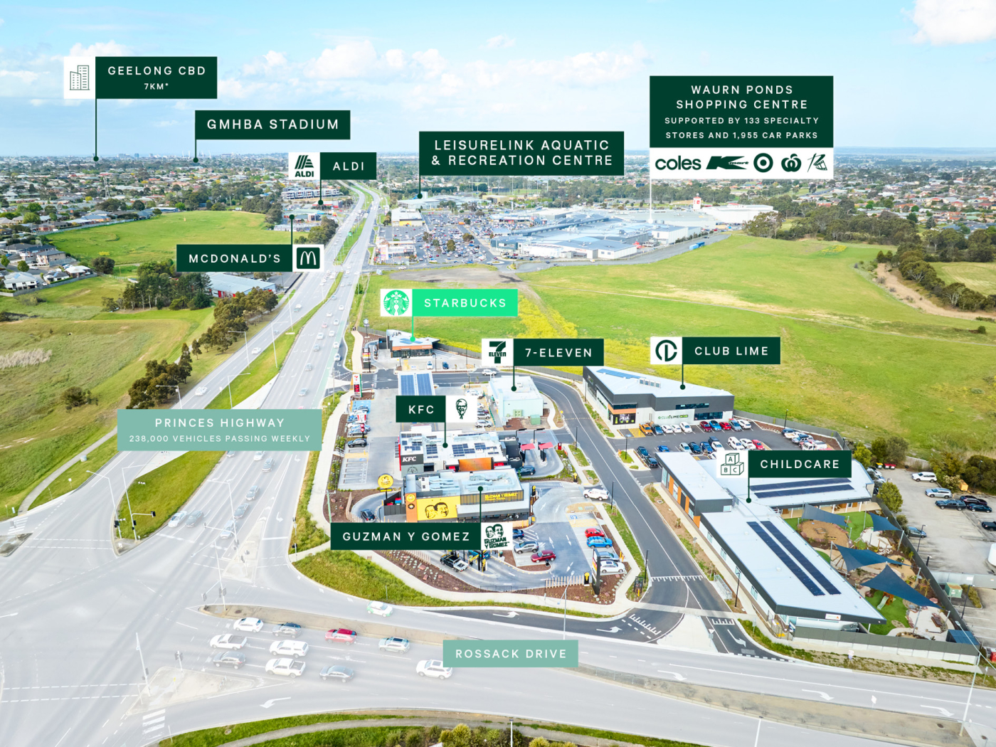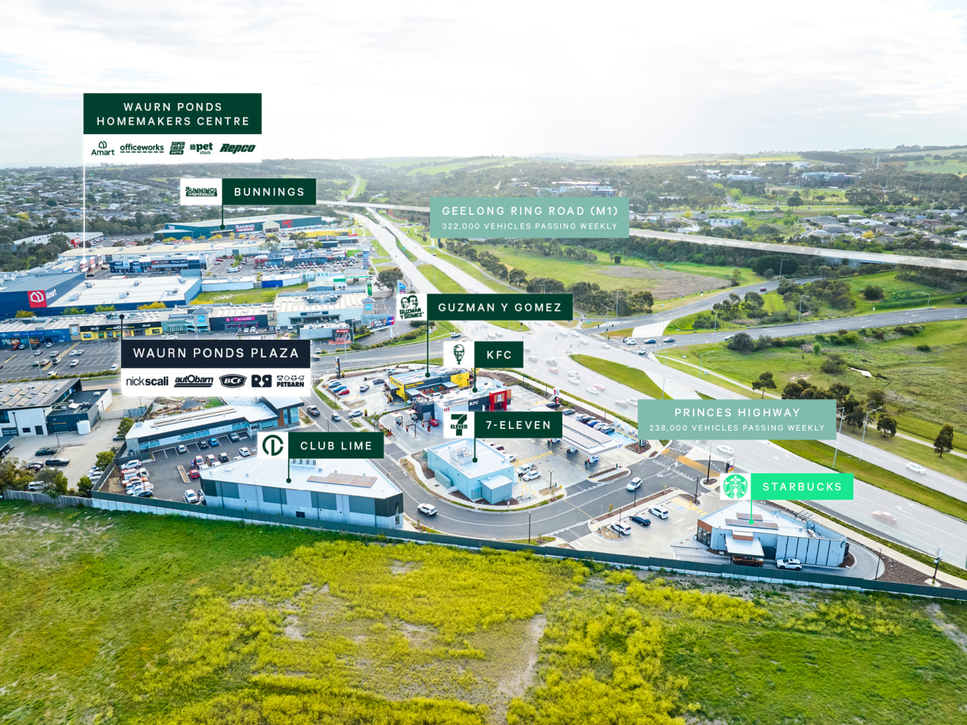 + The site also benefits from close proximity to Geelong Ring Road (M1), a critical arterial which connects the iconic Surf Coast to metropolitan Melbourne services an additional 322,000 vehicles passing weekly***