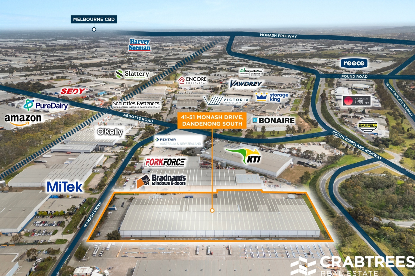 41–51 Monash Drive, Dandenong South is positioned within the highly sought after M1 Industry Park, one of Melbourne's premier logistics and distribution hubs. This blue-chip investment is securely leased to a wholly owned subsidiary of an ASX listed company, providing a long-term income stream backed by a nationally recognised brand.