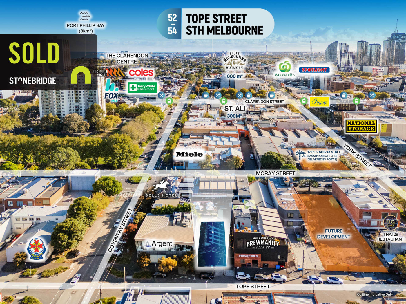 - Bookended by a number of major developments, notably Emerald Place by Lowe Living ($160m project under construction), and the forthcoming 122-132 Moray Street, South Melbourne ($50m project to be delivered by Fortis)