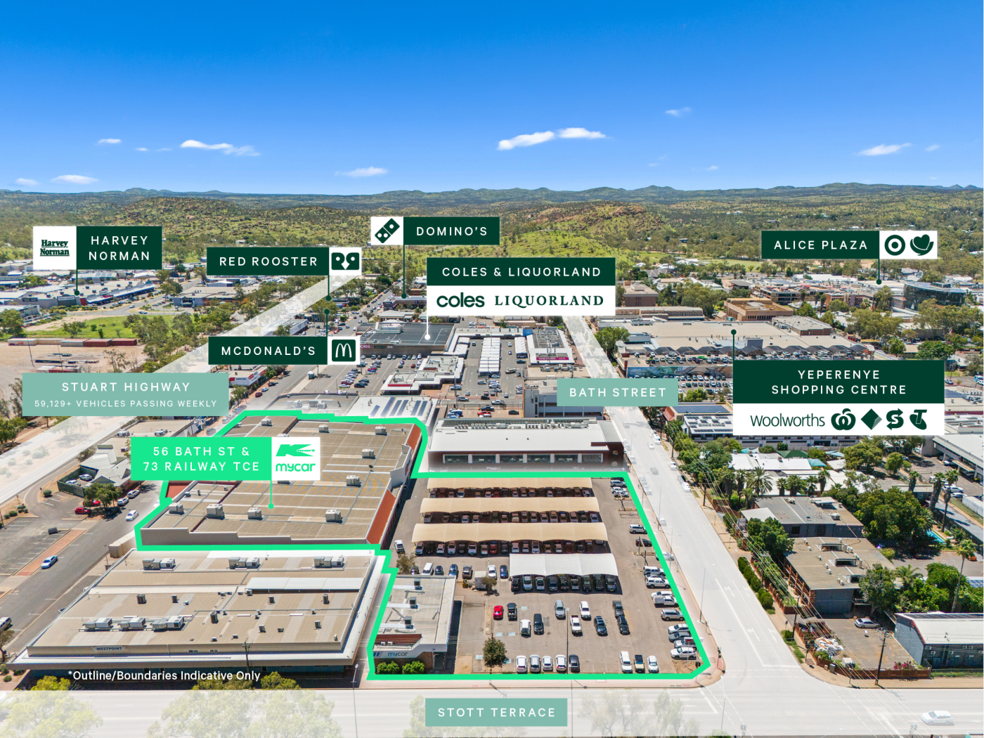 Positioned at the heart of Alice Springs’ main retail hub, this high performing precinct directly neighbours Coles, Woolworths, McDonald’s, KFC and Liquorland. As the undisputed retail destination for Central Australia, the precinct captures a vast and captive catchment with no comparable retail alternative within the region.