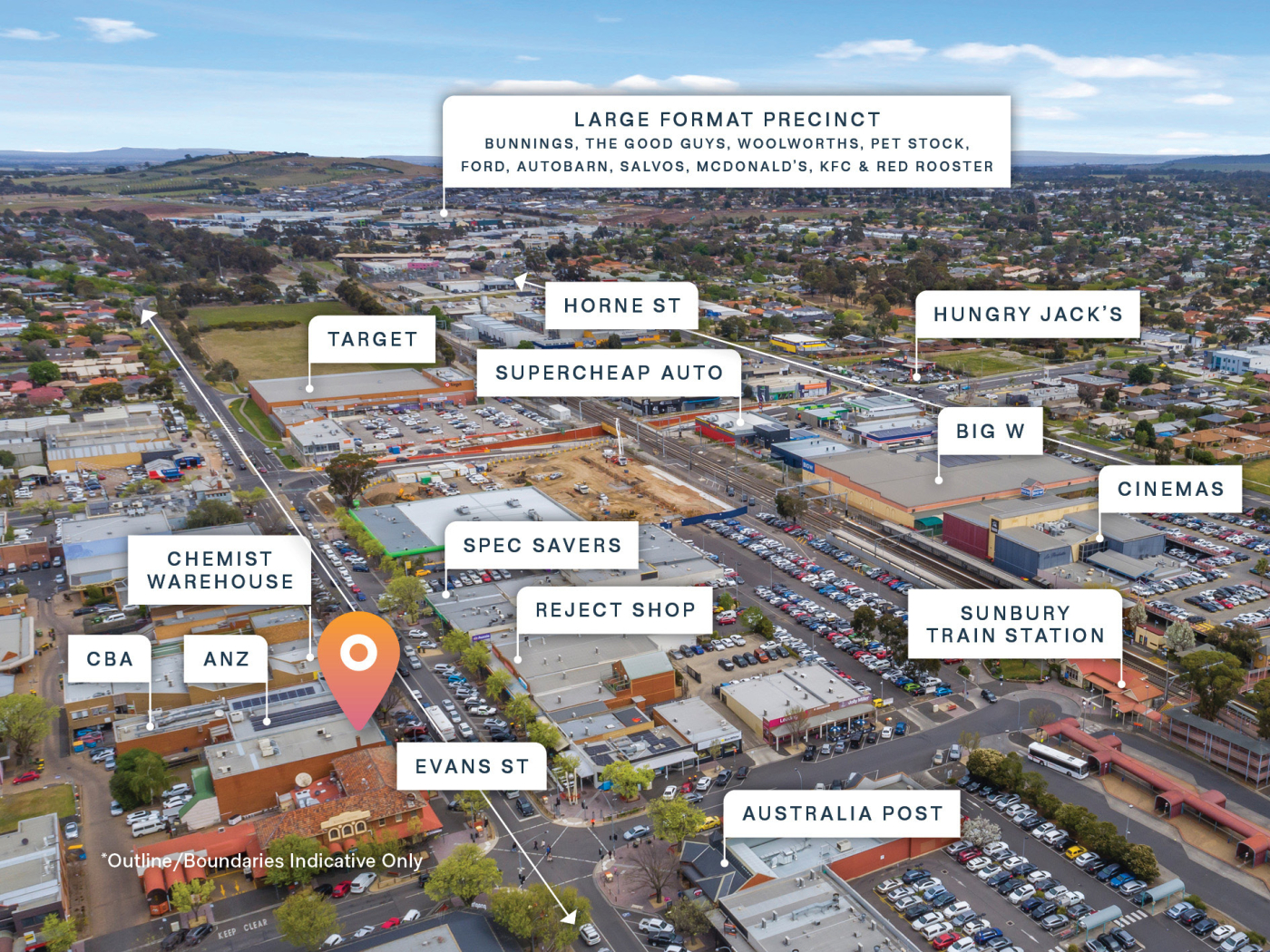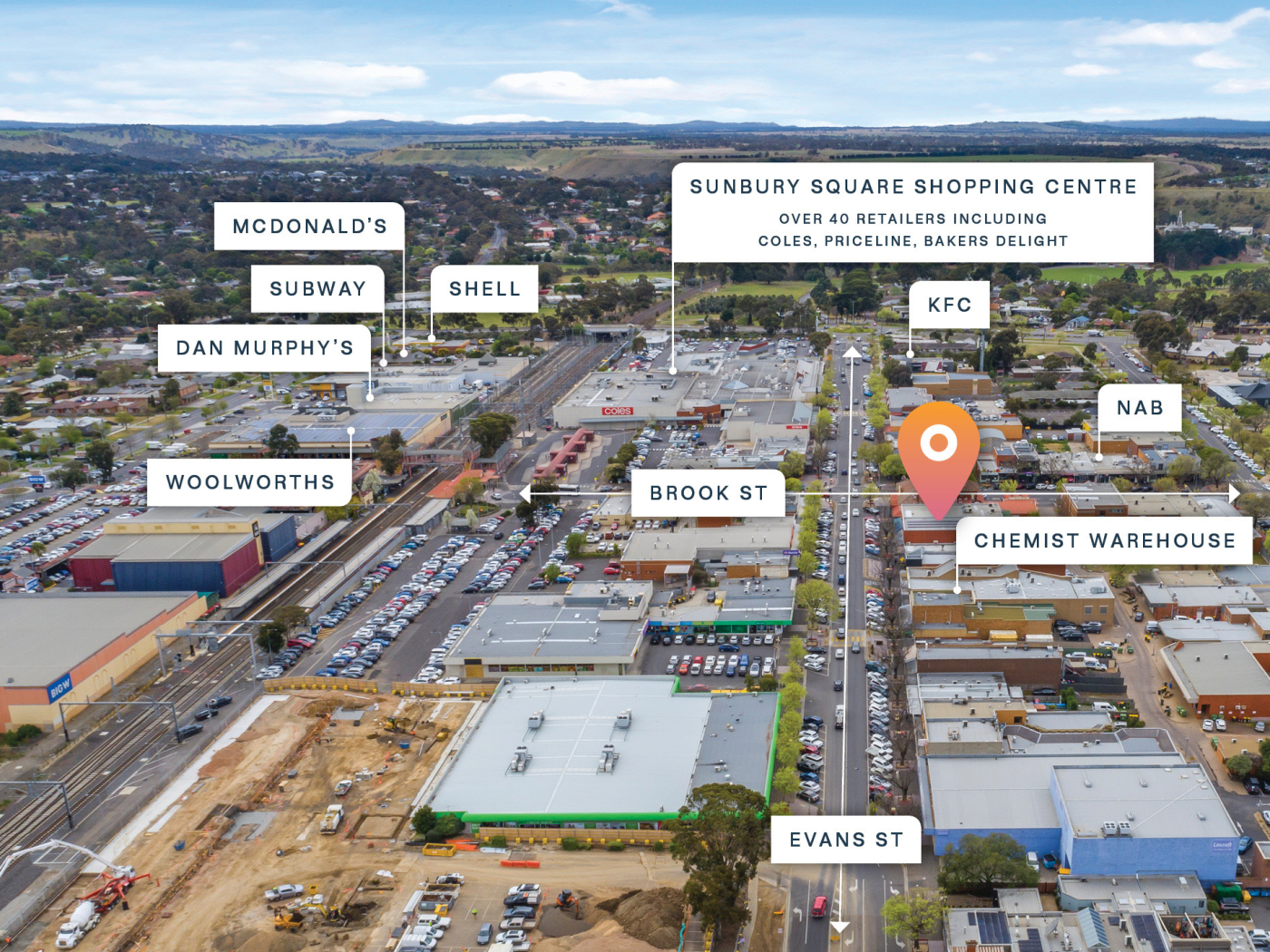 + Superb central location in the heart of the Sunbury CBD surrounded by leading national businesses including CBA, ANZ, Chemist Warehouse, Target, Big W, Dorevitch Pathology, Australia Post, Woolworths, BWS, Dan Murphy’s and Coles.