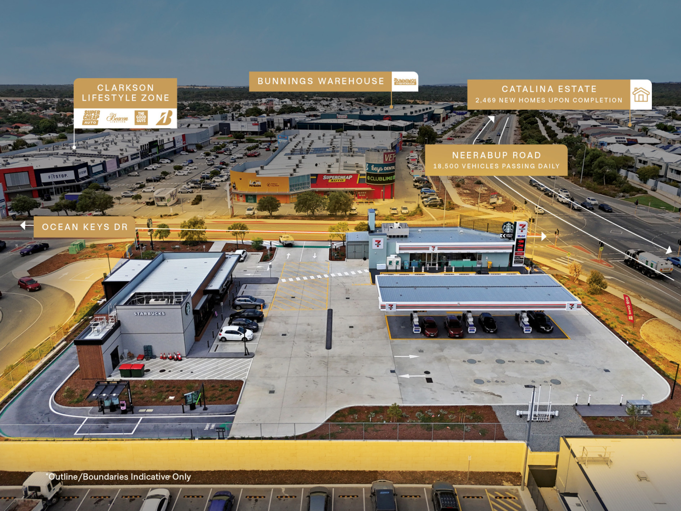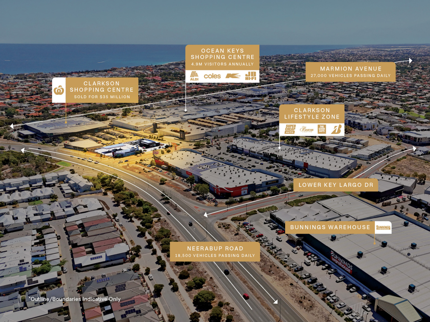 + Premium retail and commercial location next to Ocean Key’s Shopping Centre anchored by Coles, Aldi and JB Hi-Fi (4.9m* visitors annually), Clarkson Shopping Centre including full line Woolworths, Bunnings Warehouse and Clarkson Lifestyle Zone, featuring The Good Guys, Supercheap Auto, Beacon Lighting and Bridgestone. (3)