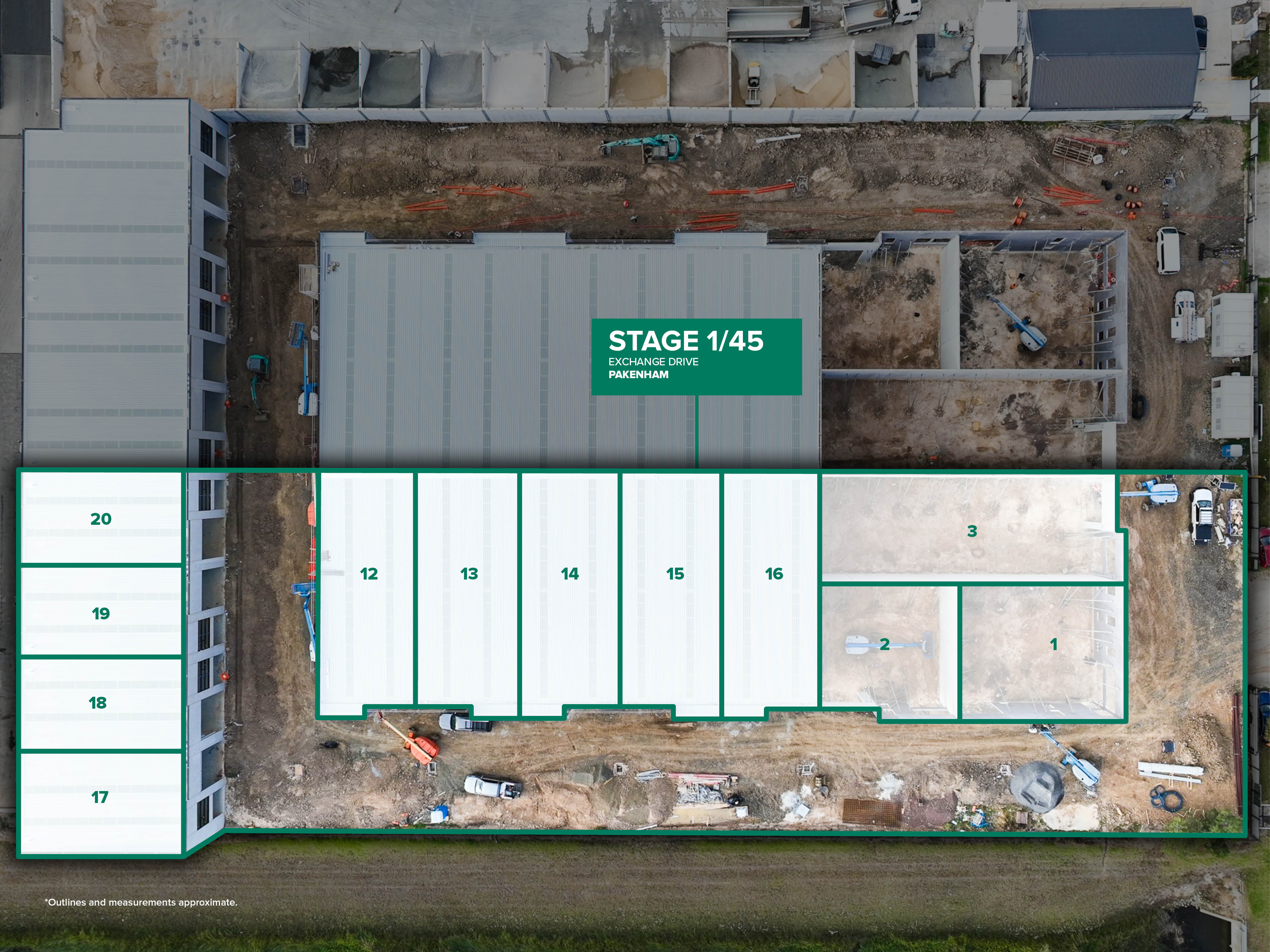 Stage 1 includes 12 premium warehouses ranging from 141 m² to 340 m².